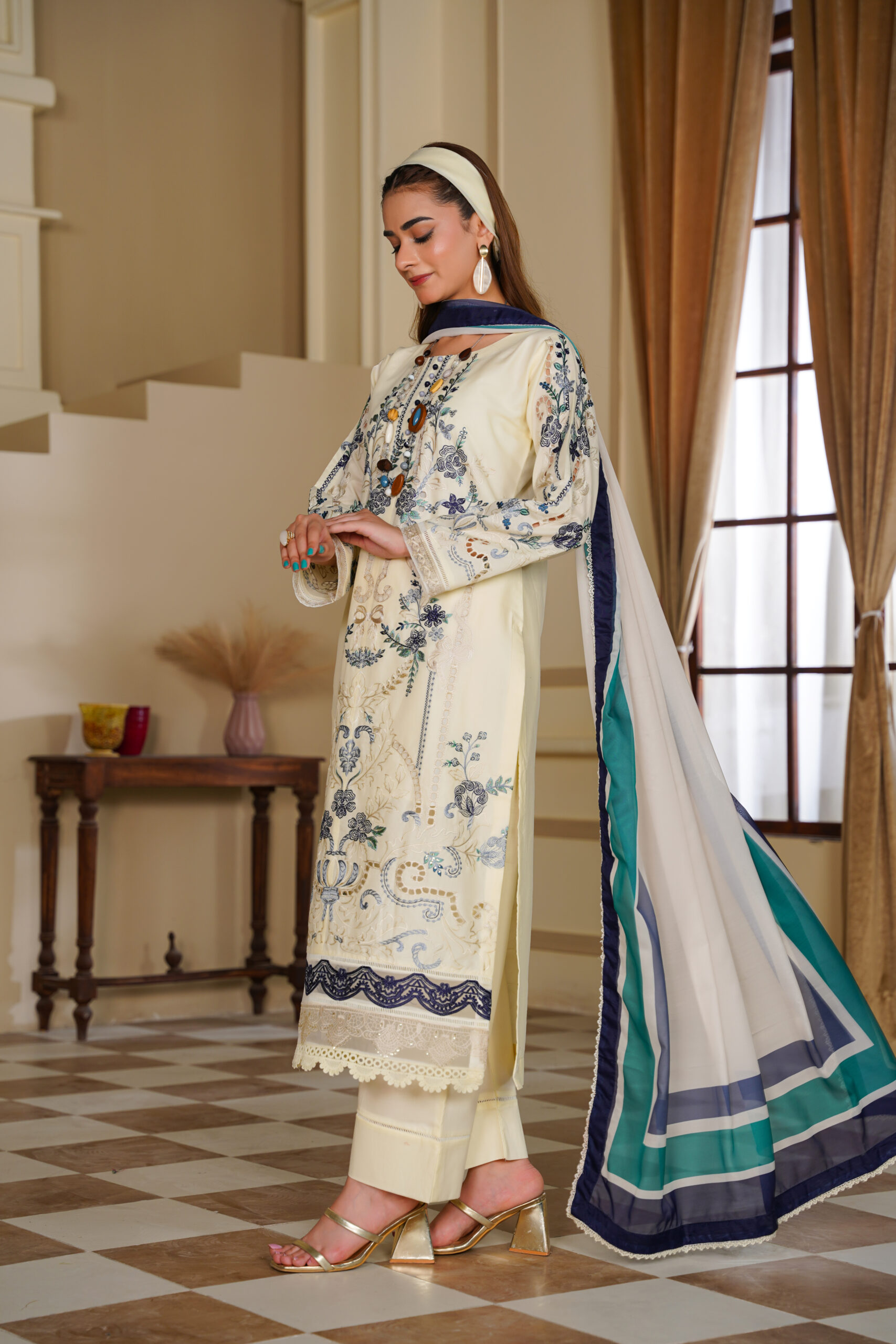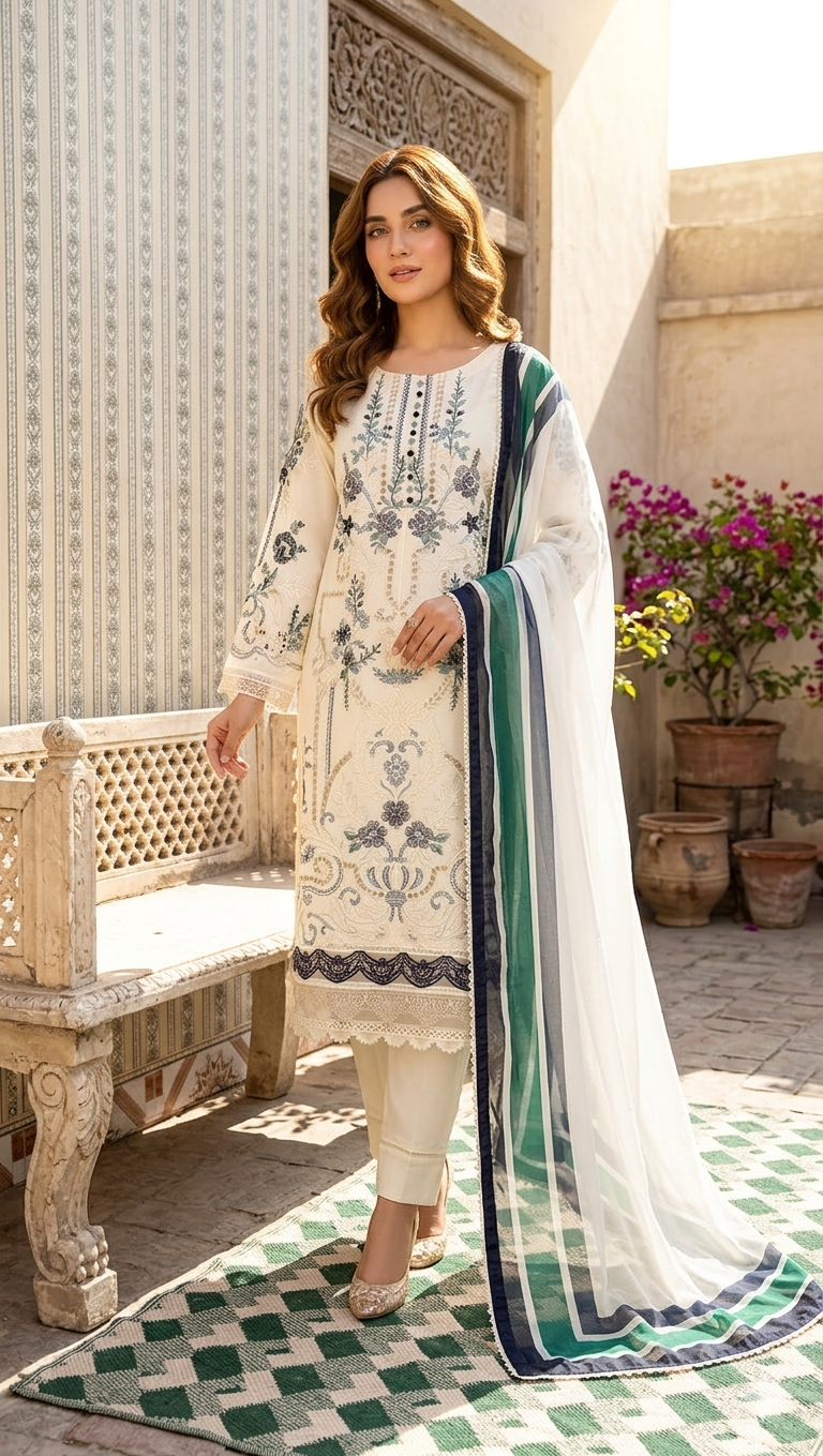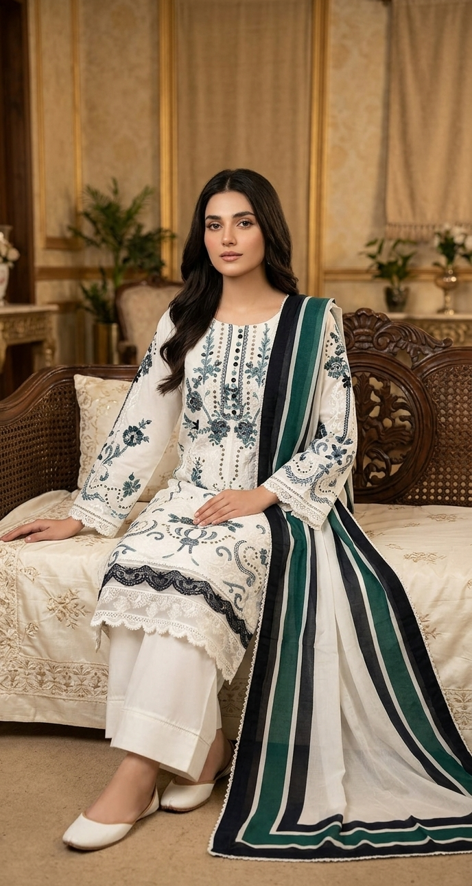 Elevate your everyday elegance with this beautifully stitched 3-piece lawn suit. The embroidered lawn shirt adds a touch of sophistication, paired with a dyed trouser for a clean and balanced look. The outfit is completed with a stylish printed silk dupatta that brings a graceful and luxurious finish.
