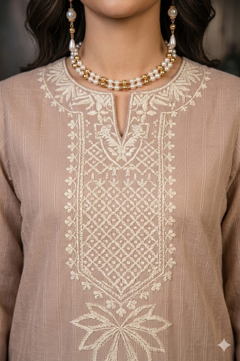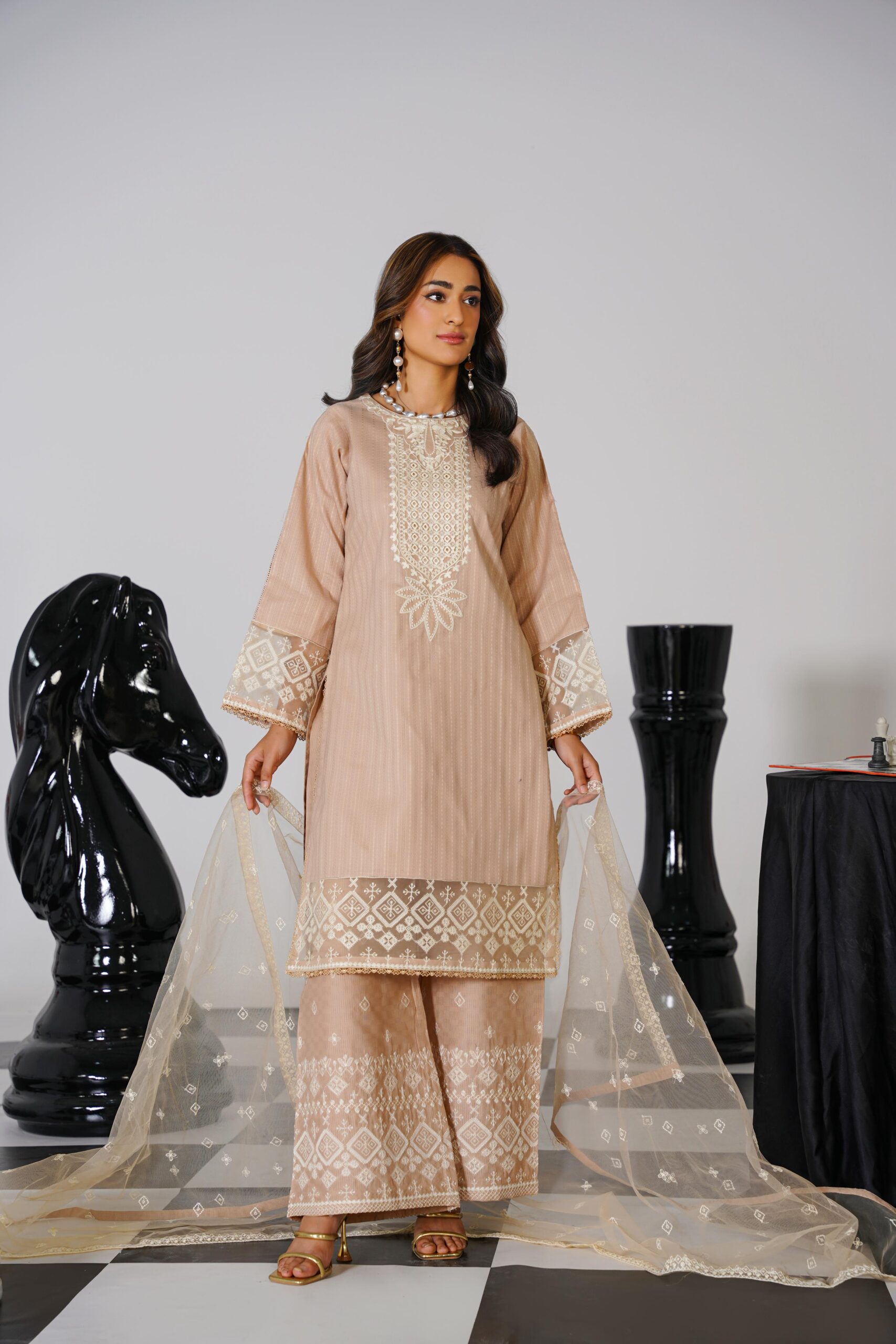 Experience refined elegance with this stitched embroidered cotton lawn 3-piece ensemble, crafted for a graceful and sophisticated summer look. Featuring delicate embroidery and a sheer net dupatta, this outfit blends timeless charm with modern luxury—perfect for elevated daywear and festive occasions.